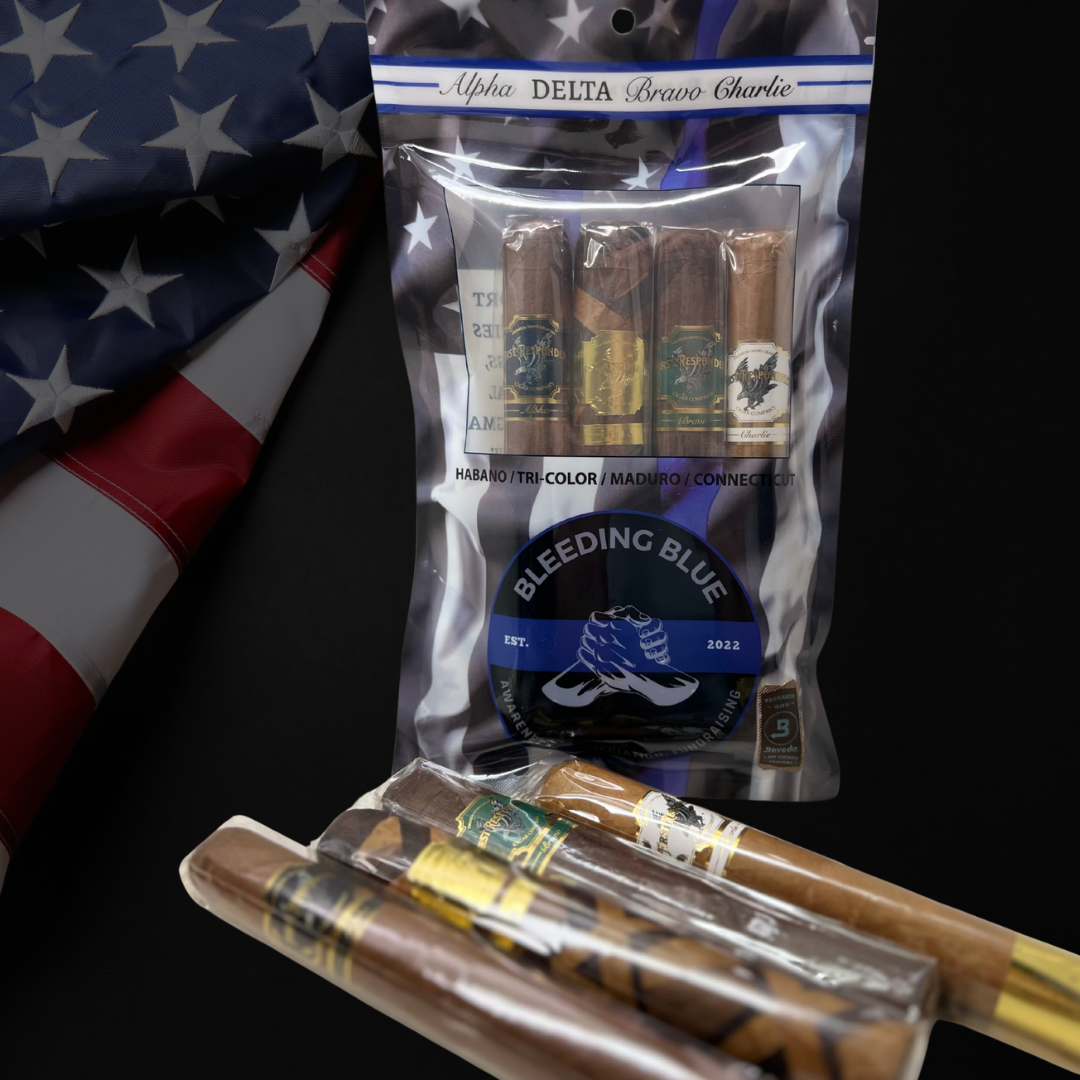 The First Responder Cigar Company sample pack allows you to try 4 cigars in one pack, while supporting Bleeding Blue’s mission